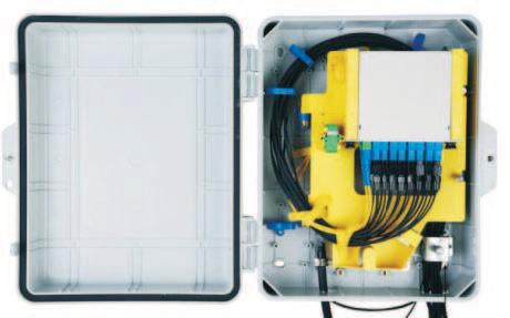 光分路箱采用高性能合金材料(ABS+PC),根据不同尺寸箱体可安装1分16和1分32插片式光分路器。配线光纤、配线尾纤、跳线光纤的进出各自独立,互不干扰,每芯均有明确的标示。具有完善的光缆引入装置和接地保护装置,便于光缆引入和固定,安全可靠。