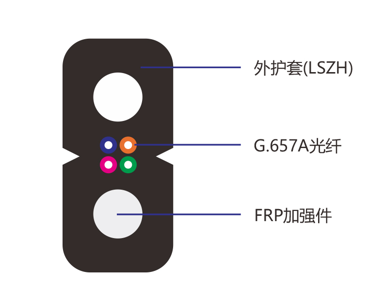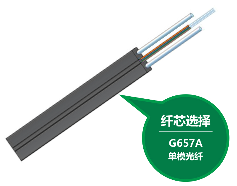 金属加强件、低烟无卤阻燃聚乙烯护套、蝶形引入光缆。在FTTH应用中,同时兼具低成本和良好的适应性两大优点,满足各种接入网用光缆的设计要求及多种接入方式,光缆成品拥有极佳的抗弯曲能力,支持密集布线、小弯曲半径下低弯曲附加损耗和搞机械可靠性,便于施工和光缆的分配,易于接续或连接。使用适用于光纤到户项目室内布线使用,线缆结构为2x3.0mm蝶形,线缆两侧为带有钢丝加强件的低烟无卤外护套,线缆中心为1-4芯G.657A光纤。